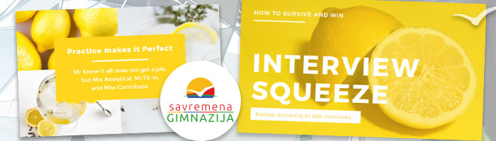 Još jedna tema koju su učenici obrađivali bila je i intervju: ono od čega veliki broj budućih studenata ima strah, jer se prvi put susreću sa takvom situacijom. Dobili su mnoge korisne savete, među kojima je i način kako da kvalitetno odgovore na prvo i često njima najstrašnije pitanje: „Šta nam možete reći o sebi za početak?”.