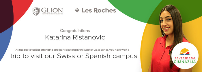 Učenici Savremene gimnazije u novembru su imali priliku da se upoznaju sa prestižnim svetskim obrazovnim institucijama Glion Institute of Higher Education i Les Roches, specijalizovanim za ugostiteljstvo i luksuzni menadžment. Putem interaktivnih vebinara učenici III i IV razreda mogli su da saznaju više o mogućnostima izbora svog budućeg poziva. Učenici koji su prisustvovali na 3 predavanja dobili su sertifikat od univerziteta, a ujedno je raspisan i nagradni konkurs za koji je bilo potrebno poslati kratak esej, a nagrada za pobednika je bila putovanje u Švajcarsku ili Španiju, uključujući putne troškove odlaska i povratka i boravak za dve 2 osobe u kampusu u trajanju od 2 noći.