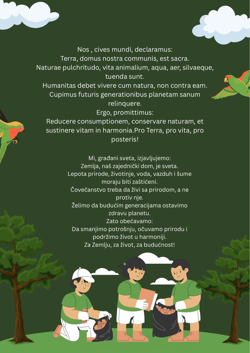 Latinsku pesmu ili himnu Zemlji – učenici sa afinitetom prema poeziji osmislili su stihove posvećene planeti Zemlji koje su pretočili u postere ili kratke video-forme, koristeći alate kao što su Lumen5 ili Canva Magic Studio.